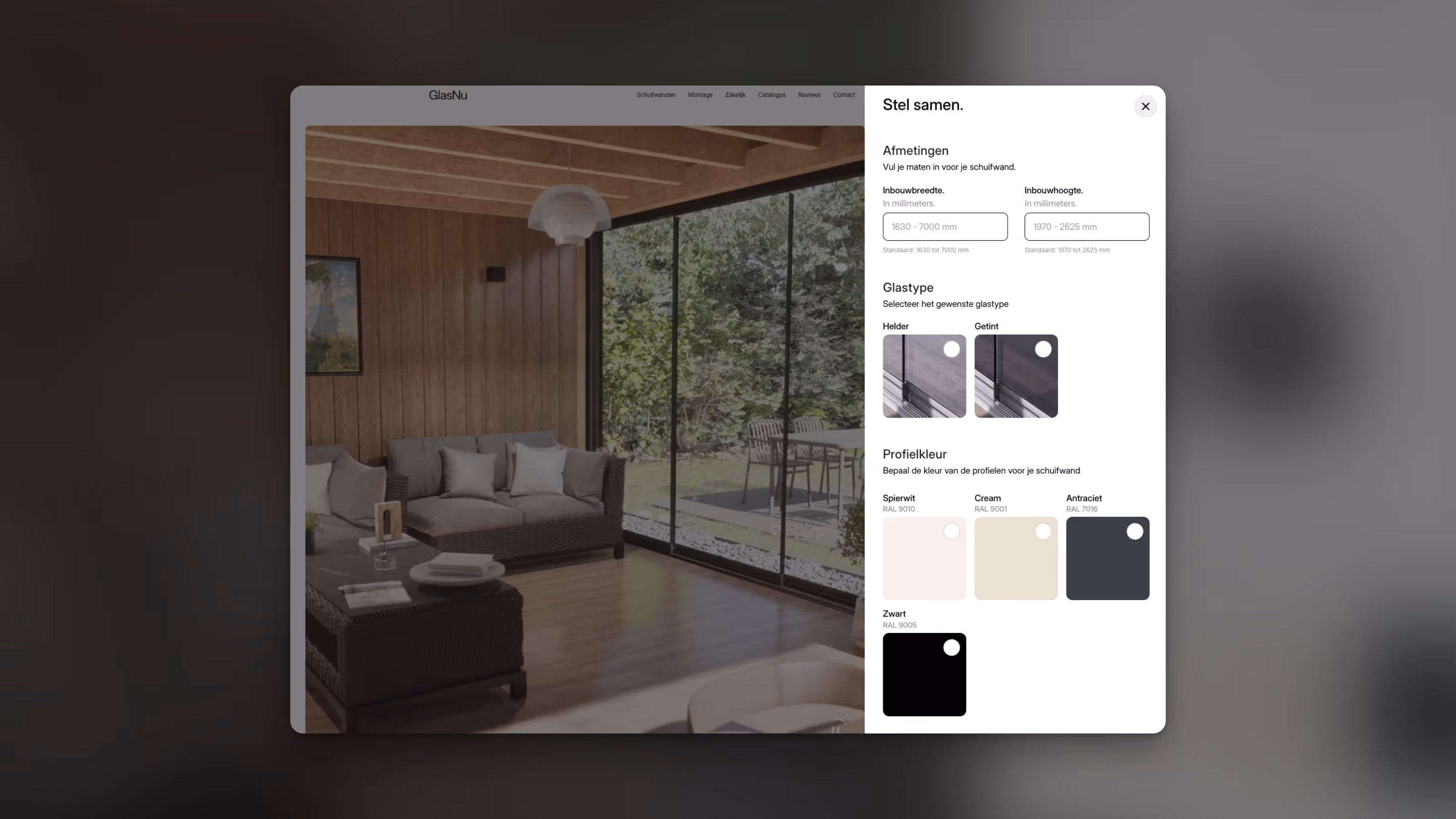 GlasNu is a Dutch company specialising in premium glass sliding walls for verandas, terraces, and interior spaces. Every order is unique: width up to 7 meters, multiple rail configurations, glass specifications, profile finishes, installation variables. Selling a product of this technical complexity through a standard e-commerce flow was not viable. We designed and built a fully custom configurator natively on Shopify, handling the entire commerce logic beneath it. Each selection updates the product, price, and visual output in real time. GlasNu customers can now configure, price, and order a fully custom glass sliding wall entirely on their own, without friction, without a quote request, without a showroom visit. The store operates with a 4.7 Trustpilot rating and same-day order processing.